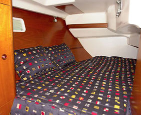 Older boat needed updates. We designed new cushions using marine grade foam in a beautiful navy blue ultra-suede. Forward berth and aft cabins got new fitted sheets and bedspread. New drapes completed the updating. Signals flags pillows are classic and popular!